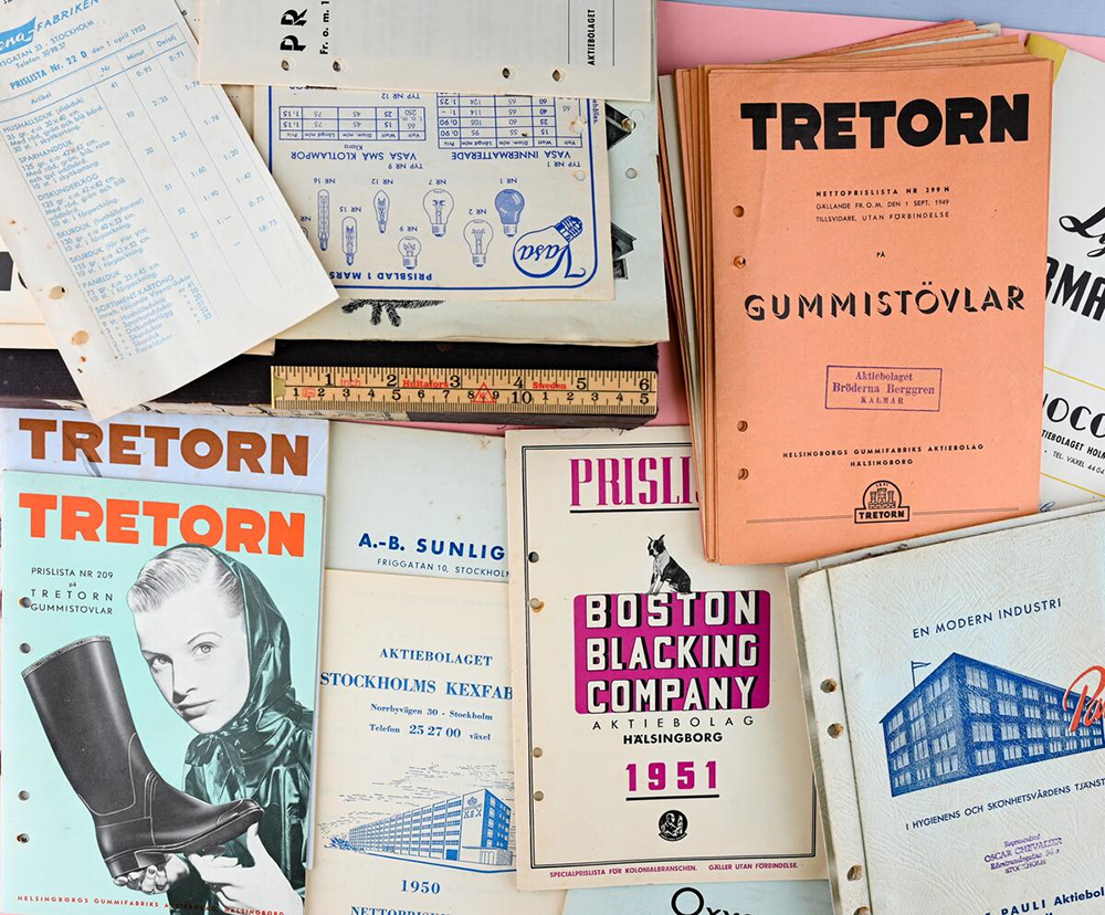 En samling broschyrer och priskuranter från en affär på Gotland, bland annat prislistor från Tretorn. 1940–1950-tal. Foto: Fredrik Sterner/Gotlands museum (CC BY).