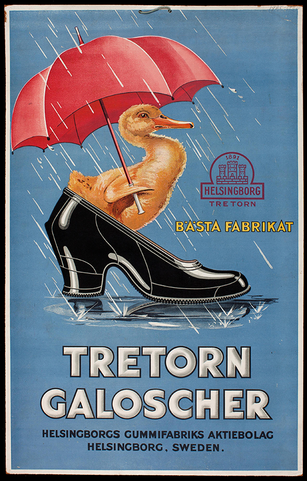 Reklamaffisch för Tre Torns galoscher från Helsingborgs Gummifabriks AB från mitten av 1920-talet. Foto: Okänd/Tekniska museet.