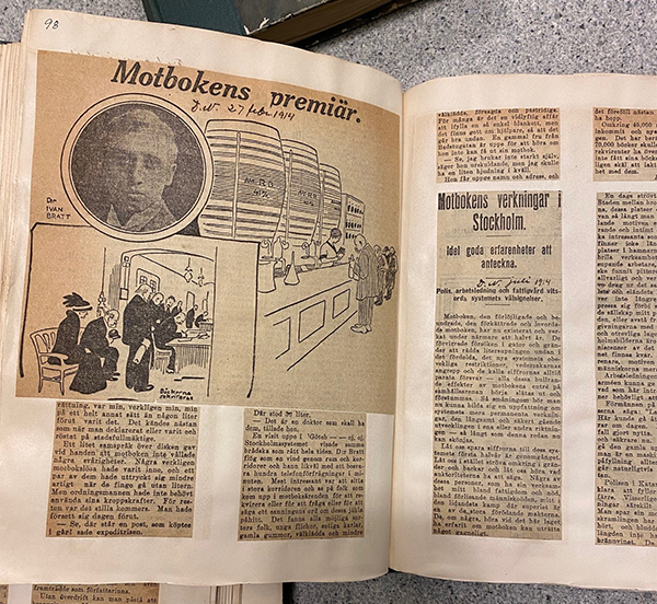Ovan ses en illustration av mot­bokens premiär i Stockholm i slutet av februari 1914. DN skriver i sin rapportering om premiären att den ”för­löpte utan kravaller och att maskineriet genast gick oklanderligt”. Den utsände reportern beskriver en hög­tidlig känsla när han mot uppvisande av sin motbok rekvirerade en liter renat bränn­vin: ”[…] som nu, efter genom­gången för­rättning, var min, verkligen min, min på ett helt annat sätt än någon liter förut varit det. Det kändes nästan som när man varit och deklarerat eller röstat i fullmäktige.”