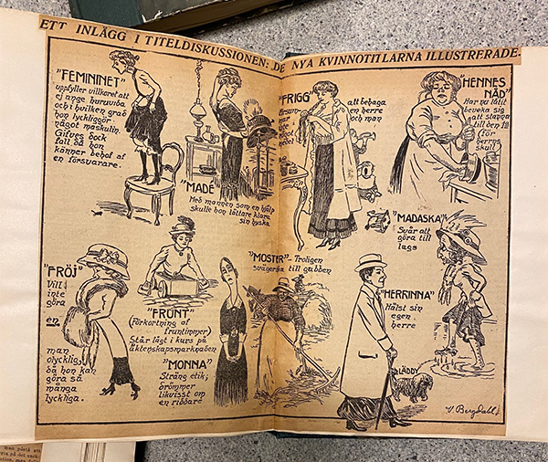 Längst bak i boken med klipp åter­finns artiklar angående den ”kvinnliga titel­frågan”. DN utlyste 1911 en tävling om vilken enhetlig titel de vanliga kvinnotitlarna ”fröken” och ”fru” skulle kunna ersättas med. Det fördes vid denna tid en debatt om att titlarna var gammeldags och inte en passande beskrivning för den moderna kvinnan.